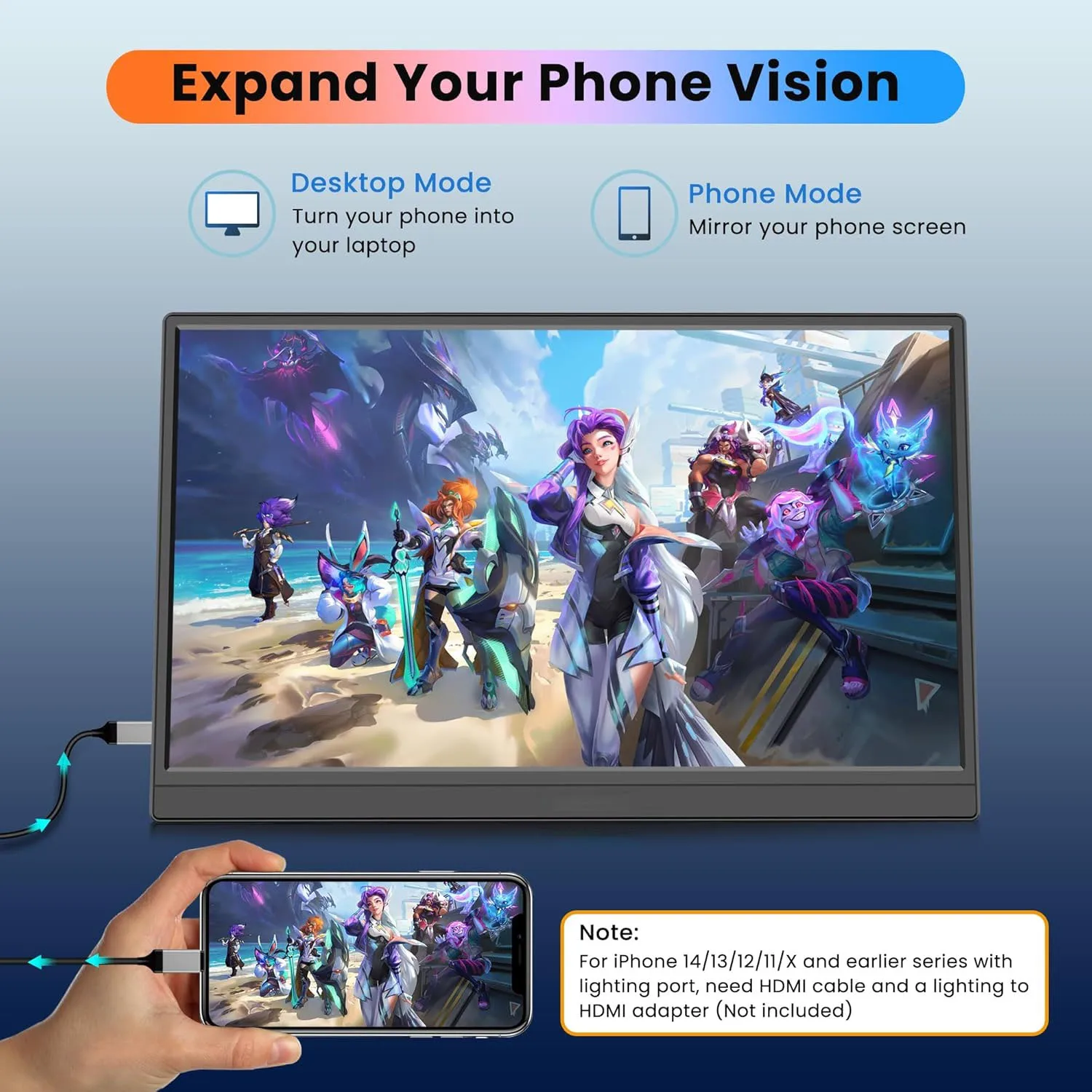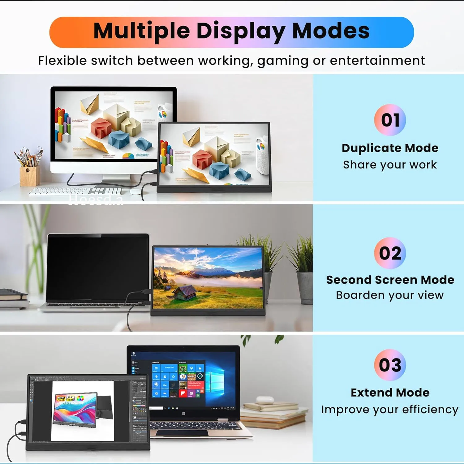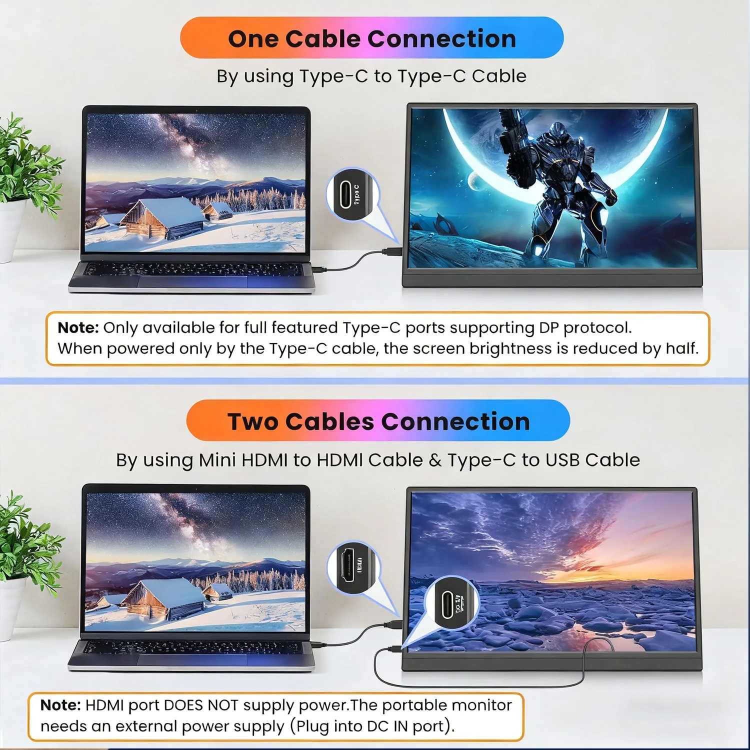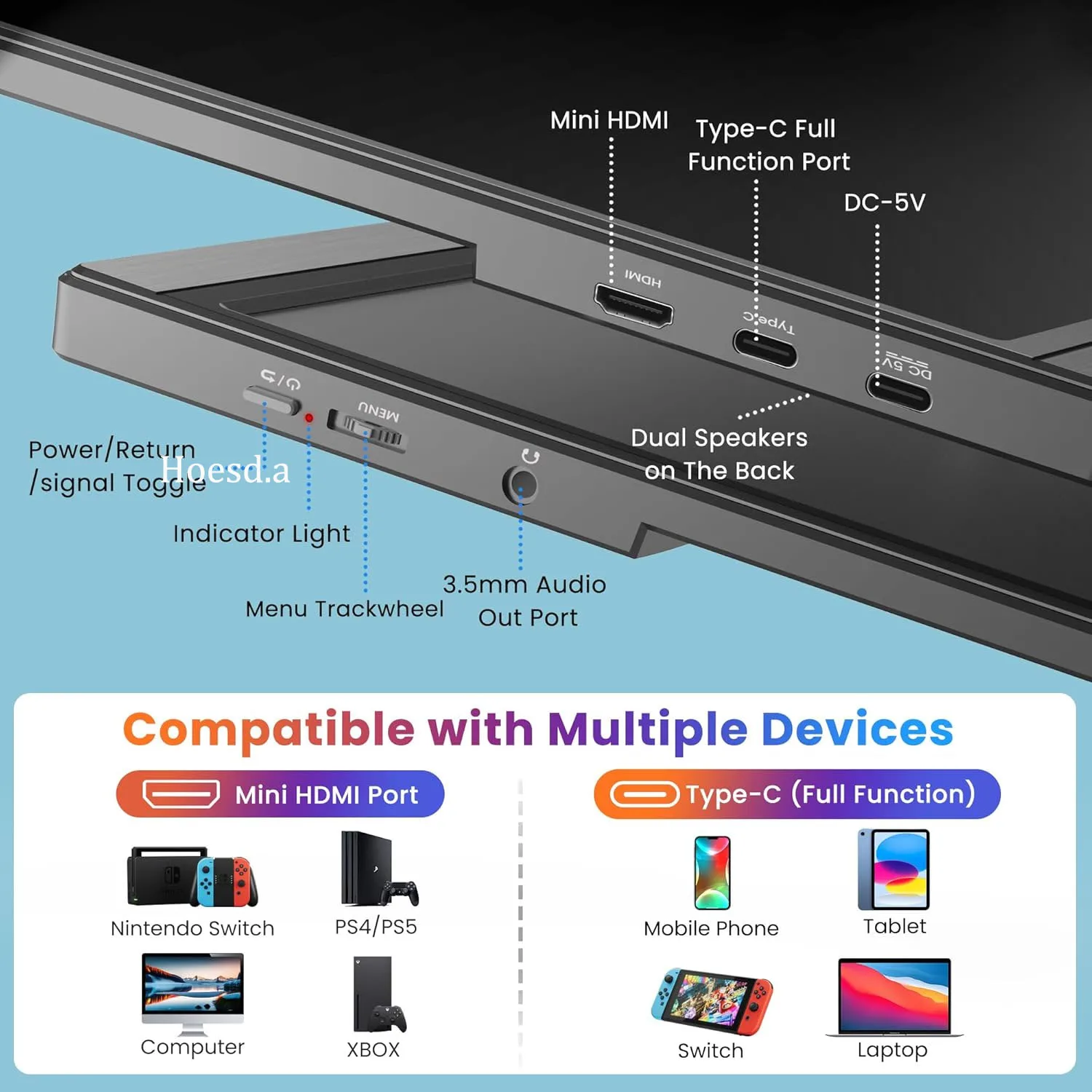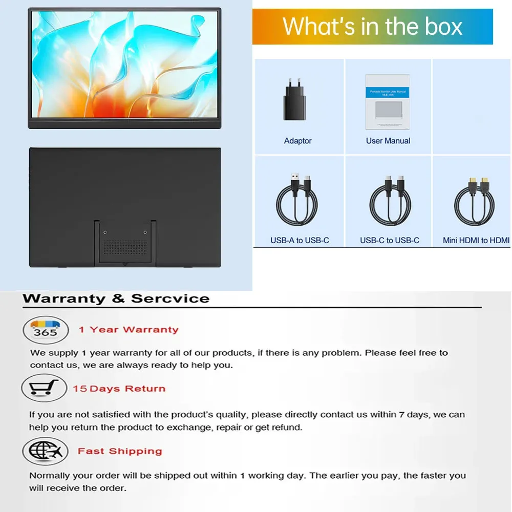 O que vem na caixa: 1*Monotor, cabo USB-C para USB-C, 1*cabo USB-A para USB-C, 1*Mini HDMI para HDMI, 1*Carregador PD, 1*Manual do usuário